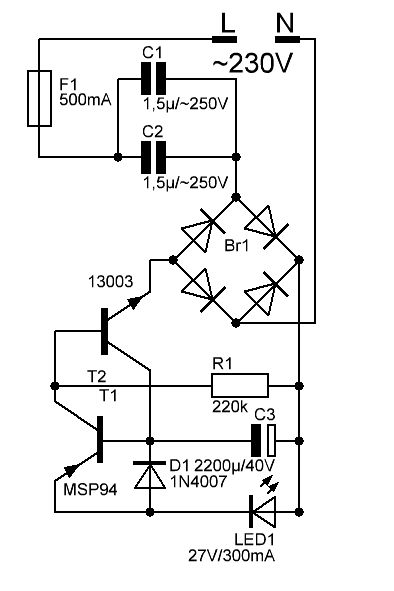 So etwas gibt es zum Beispiel fertig beim blauen Klaus, als "LED-Vorschaltplatine". Der Aufbau ist oft ziemlich einfach: Nach dem Netzkondensator (bestimmt natürlich den Strom, überbrückt mit Entladewiderstand) einfach eine Gleichrichterbrücke. Zur Einschaltstrombegrenzung ist noch ein Reihenwiderstand vorgesehen.