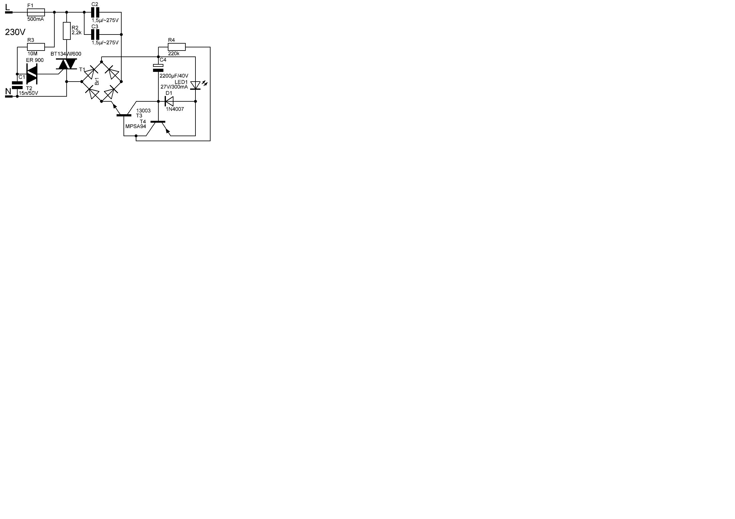 Das hatte ich schon weiter oben erklärt. Die Transistoren bilden den Anlaufwiderstand. Würde ich sie überbrücken und bei einem Phasenwinkel von 90 Grad die Schaltung anschalten so hätte ich im ersten Moment 315 V an einer fast rein kapazitiven Last, die entladen ist. Sprich einen extrem hohen Einschaltstrom. T4 ist zuerst gesperrt. T3 hingeg wird im Einschaltmoment sofort über R4 mit einen Basisstrom beaufschlagt. Damit beginnt sich T3 zu öffnen. Die Stromverstärkung von T3 ist nur etwar 8. Damit wird C4 mit einem Strom von weniger als 20mA geladen. Ist die Spannung über der LED und der D1 nun soweit angestiegen, dass sie leitend wird so wird auch die B-E Strecke von T4 leitend, der dann zusätzlichen Strom an die Basis vom T3 liefert. Damit steigt sehr schnell der Stromfluss durch C1, LED, D1 und T4, der wiederum T3 weiter öffnet. Das geht solange bis T3 Uce sat erreicht hat. Somit wirkt jetzt T3 fast wie ein Kurzschluss und ich habe die Verlustleistungen nicht, die ein Anlaufschutzwiderstand mit sich bringen würde. Über D1, T3 und T4 fallen im Betriebszustand nur etwar 0,9V Spannung ab. Macht etwar 250mW Verlustleistung. LG Christof