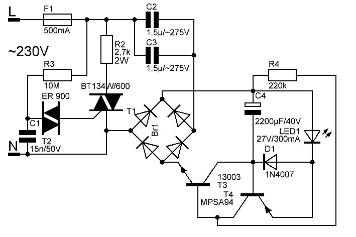 Mit Sicherheit nicht. Die verwendete LÉD kann eigendlich 50W und dann muss der Störimpuls noch an den 2200 µF Kondensator vorbei. @Lothar Die Transistoren, die du ausgewählt hast haben eine viel höhere Stromverstärkung als die, die ich verwendet habe. Du müsstest den R1 dann auf 1,8MOhm erhöhen.