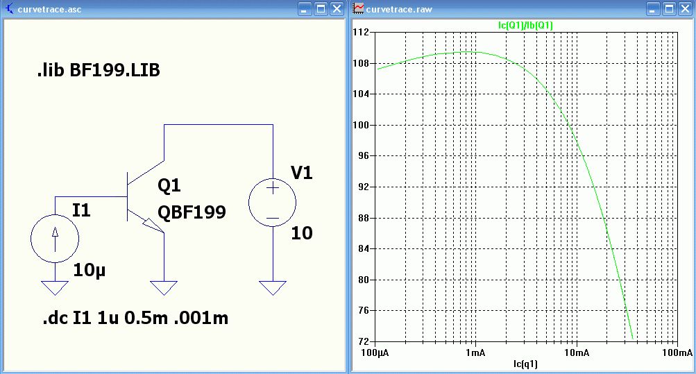 In der Grafik im DB ist das Maximum bei 5mA und in der Simulation bei 0,8mA. Die Verstärkung mit 100 kommt hin. Erst dachte ich die Grafik ist schlicht falsch, aber in der Tabelle spricht man von 7mA und vermutlich ist dort auch das Maximum gemeint. Also entweder ich mache einen Fehler oder das Modell ist schlicht komplett falsch.