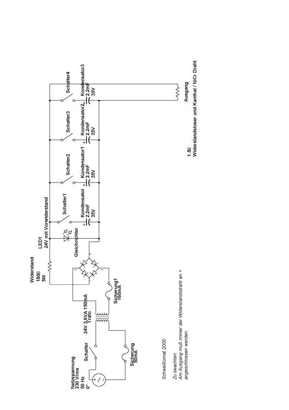 Hallo Also 1. 4 Elkos und 4 Schalter deshalb das ich die Elkos zu oder wegschalten kann je nach Drahtstärke (für dünnen Drähte brauch ich nur einen Elko da die Drähte sonst verdampfen beim zusammenschweissen)Es werden Zwei unterschiedliche Drähte miteinander verschweisst! 2.Ich will nicht den Strom zum schweissen begrenzen sondern den Strom der fliesst wenn ich den Schalter betätige weil mir der sonst wegbrennt ! D.h. beim betätigen eines Schalters, schalte ich einen Elko hinzu, der Strom der in diesem moment fliesst, von dem Elko der schon geladen ist, knallt mir den Schalter durch und diesen möchte ich begrenzen(verhindern, sozusagen den "Schaltstrom") 3. die drahtenden bzw die Klemmen wo die Drähte eingeklemmt werden haben "Dauerstrom" Gruss