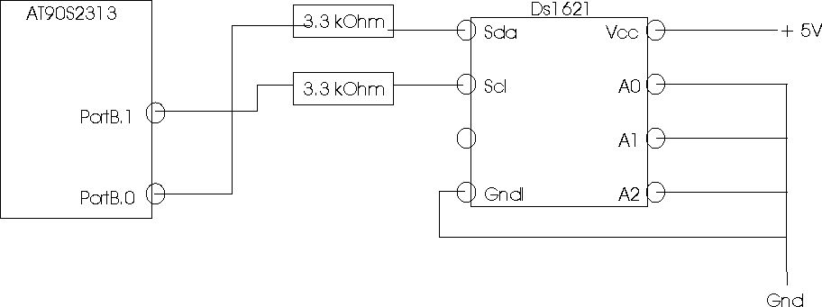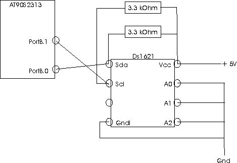 Folgendes Problem: Versuche auf einem STK500 mit einem Atmel AT90S2313 den DS1621 Temperatursensor auszulesen; der liefert anscheinend nur schrott - ich glaub nur nullen. Ansteuerung: der ds1621 ist direkt an den PortB angeschlossen. PortB.0 = sda, PortB.1 = sck. Die Adressbit liegen alle auf GND. Es wird wohl evtl. am Code liegen, nur finde ich den Fehler nicht. Zuerst hatte ich nach den Spezifikationen gearbeitet, d.h. habe ueber portB pins gesendet und ueber PinB pins gelesen, was dazu fuehrte,dass ich nur Einsen (0xFF..FFF) lesen konnte. Nun lasse ich die PortB pins immer auf null und benutze die DDRB pins zum 1 oder 0 schreiben. Jetzt lese ich nur Nullen(anscheinend). Kann mir jemand helfen? Der Code ist zwar umfangreich, aber gut dokumentiert; Schaut euch den doch bitte mal an. Oder muss ich noch etwas zwischen den Leitungen loeten??