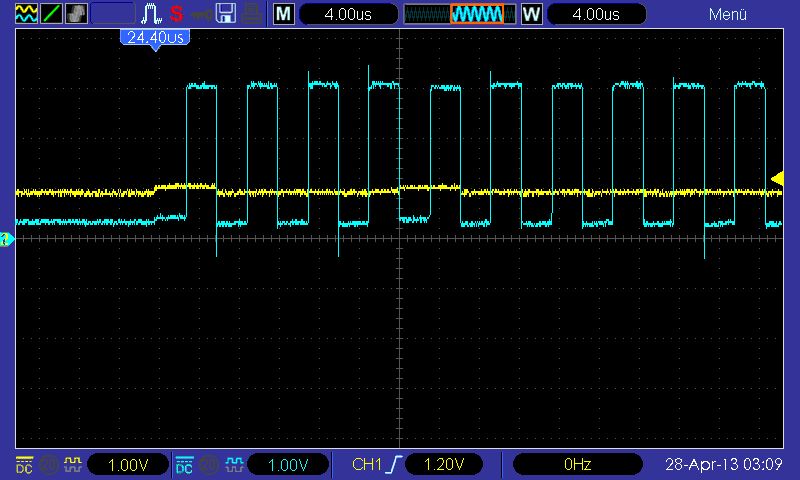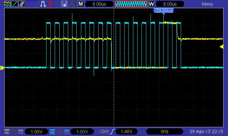 Hallo zusammen, ich versuche über SPI mit einem Sensor zu kommunizieren. Leider bekomme ich keine Antwort von diesem und habe daraufhin mit einem Oszilloskop Clock und MOSI Leitung geplottet(siehe Bild). Das ganze läuft auf einem STM32F407VGT welcher mit 3V betrieben wird. Ich versuche über den SPI3port -> "0x88" zu schicken, was auch gerade so noch im Bild erkennbar ist. Auf dem Bild erkennt man, dass die Clockleitung wie erwartet mit ca 3V-Signalen arbeitet, aber was ich nicht verstehe ist, warum das MOSI-Signal eine Differenz zwischen logisch "1" und logisch "0" von ca 200mV hat. Ich habe die Anschlußklemme auch mal umgesteckt um sicher zu gehen, dass es nicht am Oszi liegt. Die Clock-Leitung schaltet auch nach dem Tausch(der Klemmen) zwischen 0V und 3V!! Kann sich jemand erklären wo das Problem liegen könnte? Ich bin noch recht neu in der Thematik und weiß nicht, ob die Frage schon so beantwortbar ist oder ob noch mehr CODE oder Schaltplan-Details benötigt werden. Um eine unnötige Informationsflut zu vermeiden, sende ich erst einmal nur den Screenshot mit. Viele Grüße und einen schönen Samstagabend :) Florian