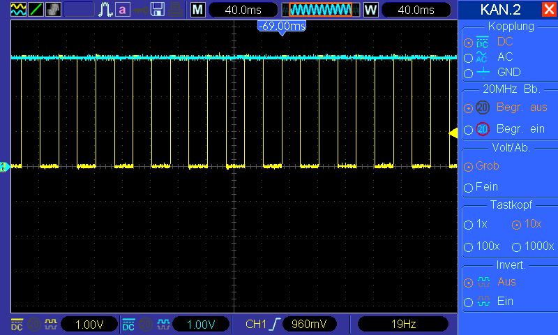 Tastkopf richtig eingestellt? Sowohl am Oszi als auch am Kopf selber? Nicht das der noch auf 1:10 steht, das Oszi aber auf 1:1 eingestellt ist? Das würde genau passen, da 0,3V ablesbar sind, das Zehnfache, 3V das ist, was du erwartest. Gruß Jannis