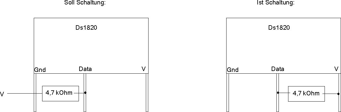 Kann meine Schaltung problematisch sein, da ich die gleiche PowerLine fuer den PullUp angezapft habe, wie in den Sensor reingeht? Auf anderen Schaltungen wird immer eine andere Stromquelle angezepft... (die Soll-Schaltung zeigt eine Referenzschaltung, die Ist- meine)