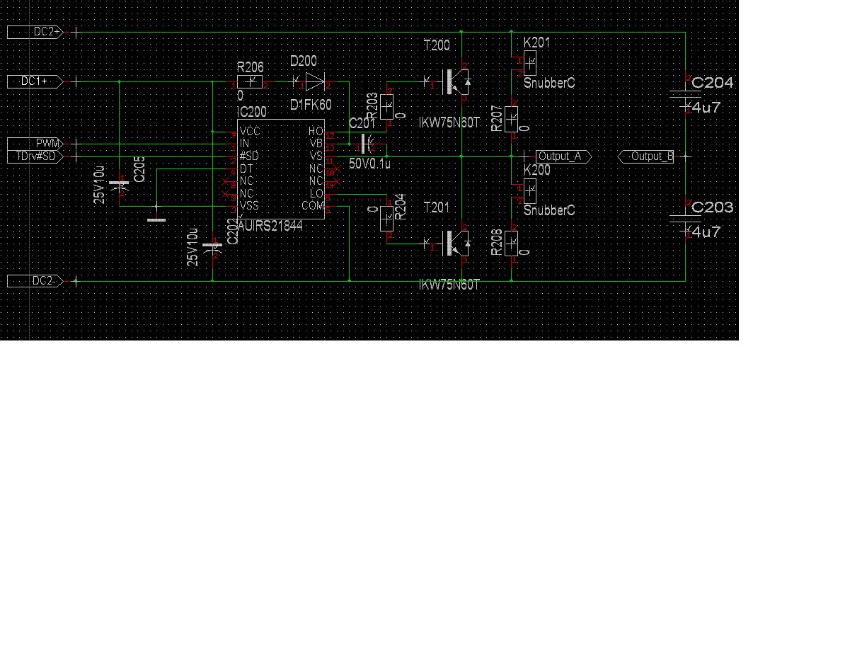 Guten Morgen Leute! Ich hoffe ihr könnt mir ein wenig Helfen. Ich versuche gerade eine Halbbrücke mit dem IC IR 218444 aufzubauen. Mit dieser Halbbrücke versuche ich gerade einen kleinen Induktionsheizer aufzubauen. Nun zu meinem Problem: Wenn ich alles nach dem beigefügten Schaltplan anschließe (Spule zwischen Output_a und Output_b), kann ich an den Gates der IGBTs das Schalten sehen solange das IC mit mind. 10 V versorgt wird. Aber sobald ich das zweite Netzteil (DC2) einschalte, wird der obere IGBT nicht mehr geschaltet. Ich kann mir das nicht erklären und stehe voll auf dem Schlauch. Die halbbrücke hab ich bereits schonmal ausgetauscht. Ich hoffe hier einen Tipp zu bekommen und bedanke mich im Vorraus das ihr euch die Zeit nimmt. Rossi