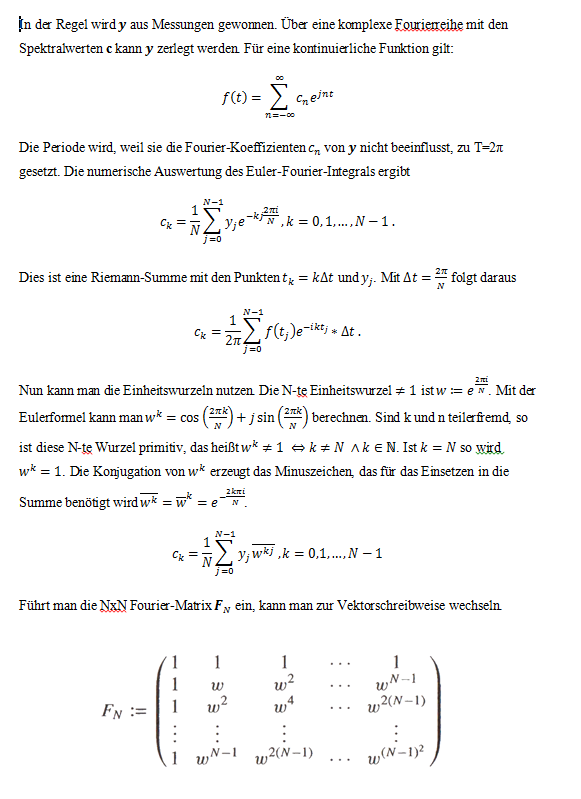 Stimmt, die richtige FFT sieht ja auch eine Verschachtelung vor (der Grund, warum N=2^m Abtastwerte benötigt werden). Die habe ich aus Zeitgründen erstmal rausgelassen und nur die Symmetrie der 2m-ten Einheitswurzeln ausgenutzt. Meine "FFT für arme" spart dadurch nur relativ wenige Operationen im Vergleich zur DFT ein, sollte aber trotzdem laufen. Habe mich dabei an dem Vachenauer HöMa 2 orientiert. Gibt es gute Quellen (möglichst frei zugänglich), wo man sich über den Einfluss des Leck-Effekts auf das Phasenspektrum schlau machen kann?
