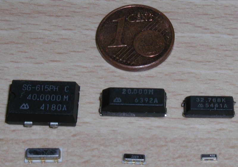 Nicht von der Zahl der Beinchen irreführen lassen. Bild im Anhang: Oben Link und Mitte: Oszilatoren mit bekanntem Pinout. Oben Rechts der ist interessant. Ein Uhrenquarz (32768 Khz) den ich einmal wie den im Bild als Oszillator habe und einmal in gleichem Gehäuse als stinknormalem Quarz wo nur zwei Pinns belegt sind. Die sind nur durch die aufschrifft unterscheidbar. Die Untere Reihe sind übliche SMD-Keramik resonatoren in verschiedenen Größen. Was die Quarze im 4 Poligen Gehäuse betrifft so ist das doch kein akt. 2 Pinne sind der Querz und die anderen sind entweder frei oder verbunden. Kanst se ja ignorieren. Oder meinst du die Pseudoquarze wie diesen hier ? http://www.geyer-electronic.de/content.aspx?linkSel=14&typSel=2&menuSel=31&langSel=0 Hier noch ein Link zum schauen http://www.aelcrystals.co.uk/plastic-moulded.shtml