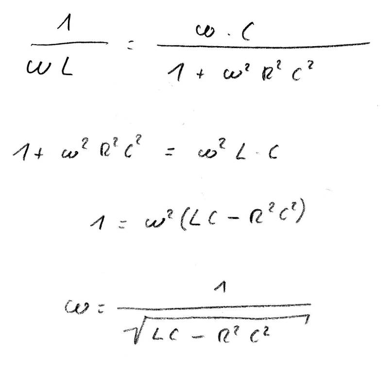 Forum: Offtopic Gleichung umstellen(Resonanz)Hallo, ich bin gerade am ausrechnen der Resonanz eines Schwingkreises. Dabei weiß ich nicht wie ich folgendes nach Omega (w)auflöse..vielleicht kann mir ja jemand helfen! Grüße jumper Wolfram alpha: "1/(ω*L)=ω*C/(1+(ω*R*C)^2) solve for ω" Ergibt: C^2 R^2!=C L and omega = ±1/sqrt(C (L-C R^2)) and L!=0 Hunt Worker schrieb: > http://www.wolframalpha.com/input/?i=1%2F%28%CF%89... Danke...aber wie kommt man auf das Ergebnis?Rechenschritte? Brüche über Kreuz multiplizieren und die quadtratische Gleichung mit der p-q-Formel lösen. >Wo siehst du da eine quad. Gleichung