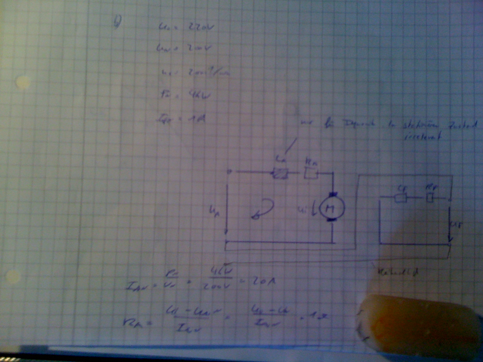Jetzt schauts einfacher aus. Also, wir haben die Anschlussspannung von 220V, eine EMK, Motorenspannung von 200V, dh ueber dem Innenwiderstand falls 20V ab. Aus der Leistung und der Motorenspannung rechnet man den Motorenstrom als 20A. Die 20V durch die 20A ergeben 1 Ohm Innenwiderstand. Der Rest is zwar informativ, aber unwichtig.