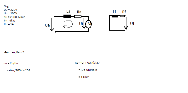 Also erst einmal ist in der Aufgabe eine Reihenschlussmaschine. Und es ist überhaupt unklar welche Maschinentyp das nun sein soll. Also ohne Bleistiftzeichnung wäre es fremderregt. Von Nebenschluss sieht man hier nix. Ui ist die induzierte Spannung in der Motorwicklung, wenn der Motor sich dreht. U0= Leerlaufspannung sprich wenn man keine Belastung am Motor hat und keine Stromaufnahme erfolgt. ist einfach nur eine Bezeichnung Ua ist die Eingangsspannung, Un ist die Nennspannung für die der Motor ausgelegt ist. Meistens ist es egal was man hat man kann annehmen was man will. Ich nehme mal an, dass du den Nennstrom im Nennbetrieb berechnest. Da das Foto ganz schlecht ist kann man dir auch schlecht helfen.