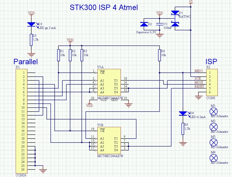 ja, das war mir bereits klar. der isp, welchen ich bei reichelt gekauft habe, nutzt auch SPI, dort ist aber nach dem programmieren der reset weg, d.h. der proz beginnt mit der ausführung des programms. beim selbstbau isp bleibt der proz im reset, bis man den stecker abzieht. das sollte aber laut schaltplan nicht so sein, weil der OE des 74hc244 ja benutzt wird, also sollte die software den ausgang des gatters auf hochohmig schalten, wenn der programmiervorgang abgeschlossen ist. tut sie aber nicht. meine frage war also, ob jemand, der ein vergleichbares gerät nutzt, ein ähnliches verhalten feststellt. ich poste nochmal den schaltplan dazu...