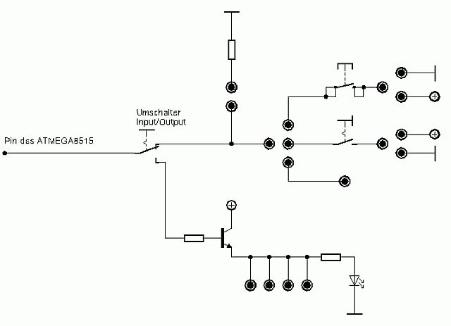 die Ports über Schalter zwischen I/O umschalten ist teuer und aufwändig. Da finde ich die Lösung vom STK500 ganz gut: alle Ports sind über gleiche Stecker (10pol. Pfostenstecker) nach aussen geführt. Über ein Flachbandkabel kann man dann die Ports mit Tastern oder LED's verbinden. Hat allerdings den Nachteil dass dann immer 8 Bit In oder 8 Bit Out sein müssen. Ich habe mir daher ein Adapterkabel gemacht mit dem ich von den 10pin Pfosten auf einen 10pol. Leiterplattenverbinder gehe und den dann in ein Steckbrettt einstecke, da kann dann beliebiege Peripherie draufgebaut werden.
