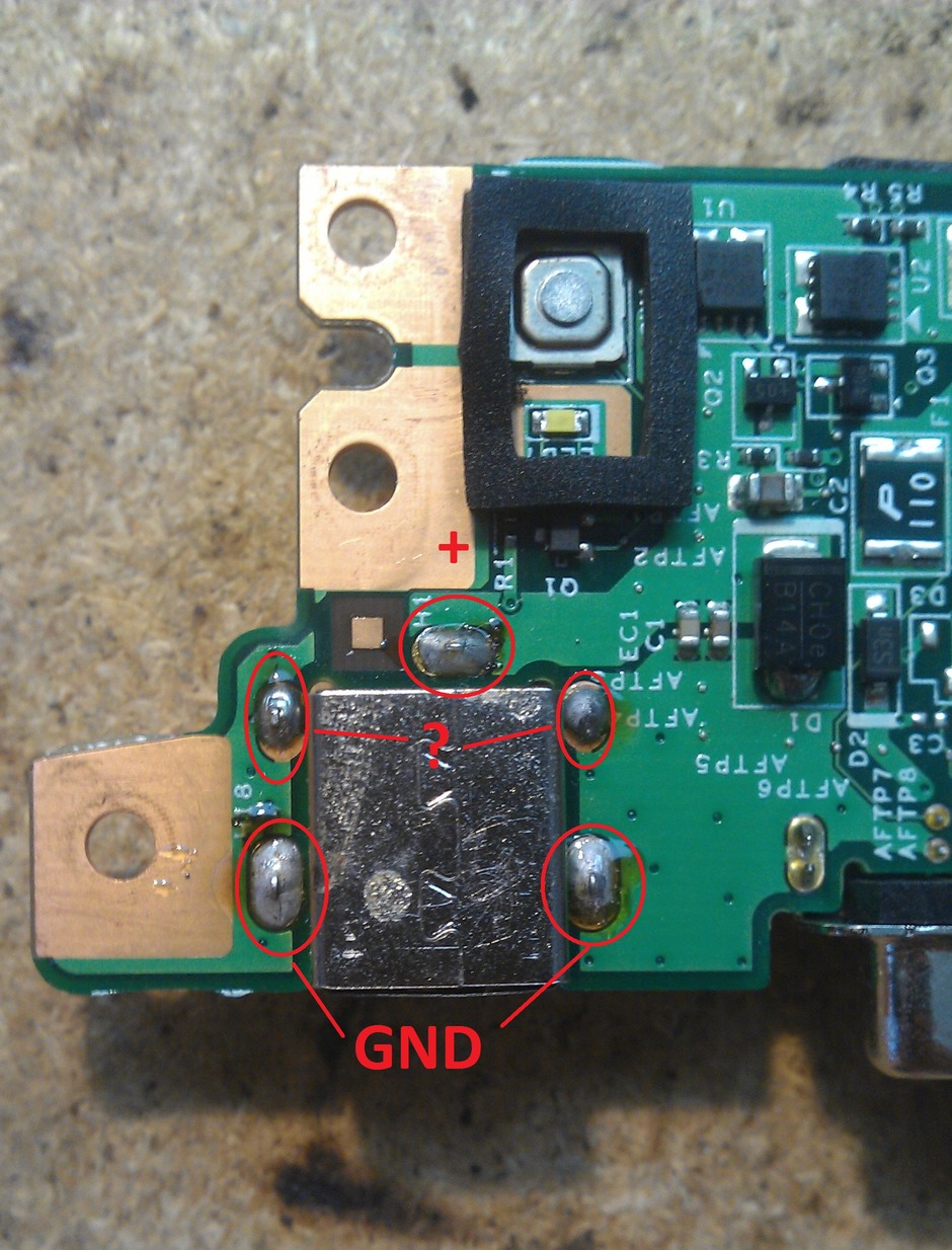 Hi Leute, ich habe hier ein Lenovo ideapad u160 vor mir liegen. Es scheint irgendeinen Wackelkontakt zu geben.... Doch meine eigentliche Frage ist folgende: Auf dem Bild ist die Eingangsbuchse zu sehen. Mit dem Multimeter konnte ich plus und GND identifizieren, alles cool bis dahin. Doch die mit dem Fragezeichen markierten Pins "schweben" quasi in der Luft, haben keine elektrische Verbindung zu Ground. Aber die ?verpolschutz?? Diode D1 hat Durchgang zu eben diesem Pin und nicht zu Ground. Nun habe ich aber Skrupel einfach ne Lötbrücke zu den GND pins zu ziehen. oder sollte ich das doch machen? Vielen Dank für jeden input Chris