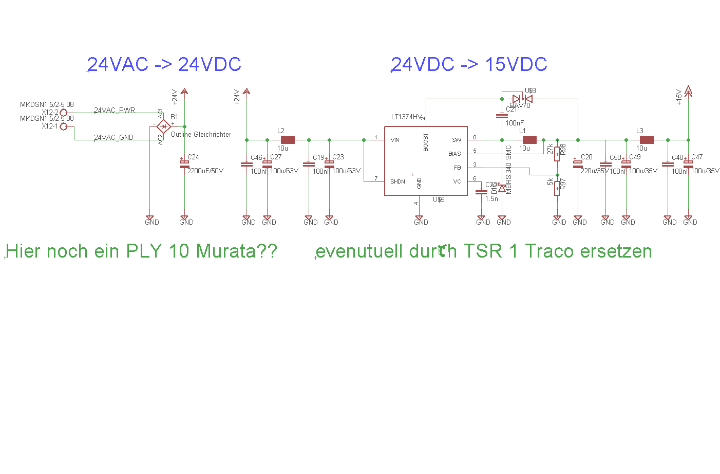 Hallo liebes Forum, ich benötige für mein Board eine stabile 12VDC Quelle. Als input kommt zur Platine ein 24VAC Signal. Daraus will ich in einem ersten Schritt 12V machen(mit Schaltregler). Die 12V will ich dann noch mit einem Linearregler(oder auch Schaltregler) auf 3.3V runterschrauben für eine 20bit ADC Wandlung. Welche Filter muss ich vor und nach dem Schaltregler bauen? Hatte da an den TSR-1-24120 gedacht, dann muss ich die externen Komponenten nicht aufbauen und bin sicherer, dass es nicht so viel abstrahlt, wie ein Eigenbau. Allerdings ist mir das Ripple das der TSR macht deutlich zu hoch. Vorher am besten dann ein Pi Filter und nacher auch? Wie dimensioniere ich den? Der Schaltregler hat ne Frequenz von 500Khz. Welche Spule und welche Kondensatoren? Elko, Tantal, Kerko? Oder lieber EMI Filter von Murata? Macht es Sinn vor den Gleichrichter noch eine Murata PLY 10 zu setzen? Naja bin halt Anfänger und habe noch nie unter so low noise Anforderungen gearbeitet. Außerdem lieest man überall was anderes. Wäre für Hilfe echt dankbar.