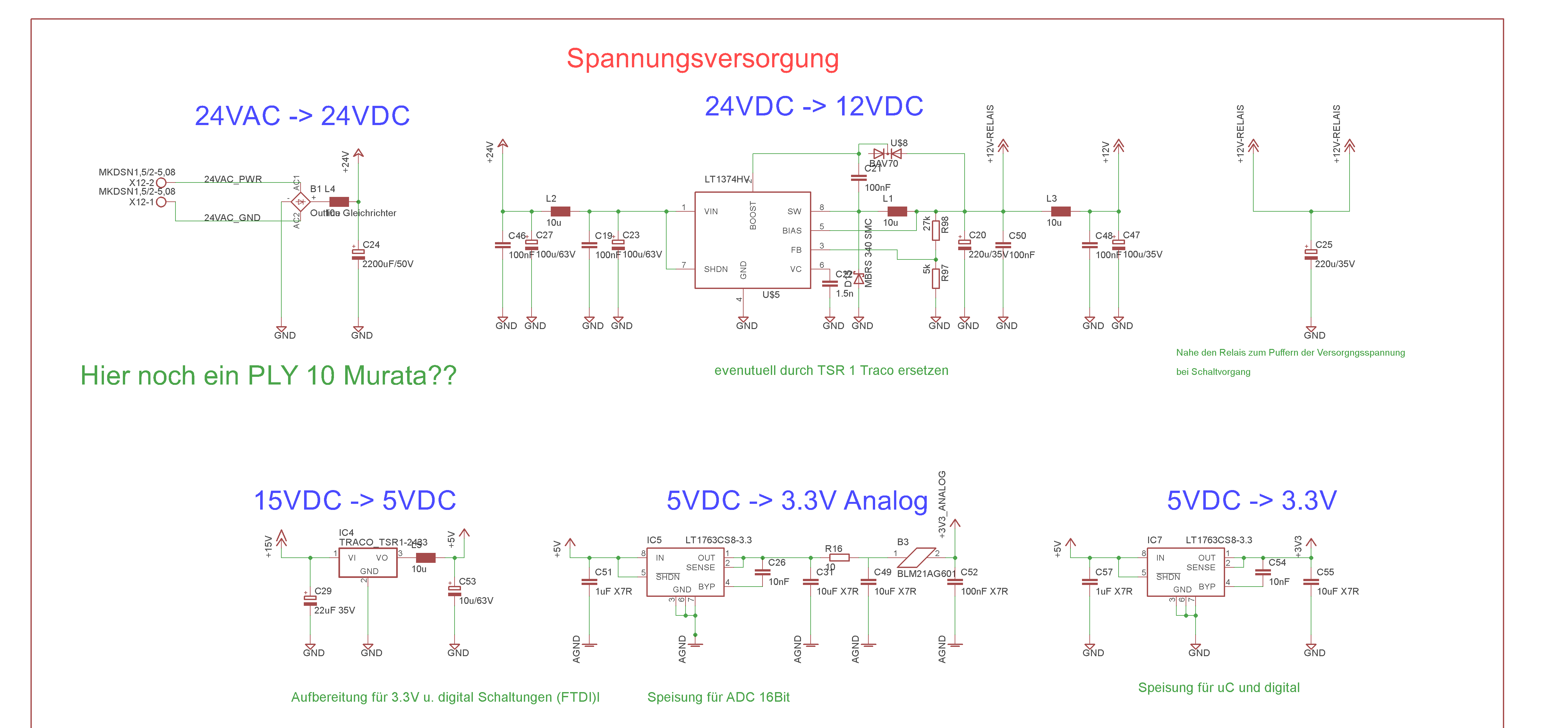 Hey Leute, so habe jetzt die komplette Spannungsversorgung aufgebaut, so wie ich Sie mir vorstelle. Hab ich mir eigentlich alles angelesen und versucht umzusetzten. Hoffe das ist halbwegs geglückt. Habe auch versucht, zumindest jetzt erstmal vom Schaltplan her, die EMV Sachen möglischt gut umzusetzen. Es wäre cool, wenn ihr Cracks mir Feedback geben könntet und vielleicht Tipps, was verbessert werden muss. Gerade hinsichtlich der Dimensionierung und ob ich es über bzw untertrieben habe mit der Filterung. Die großen C's dachte ich an low ESR Elkos. Schonmal vielen Dank!!!