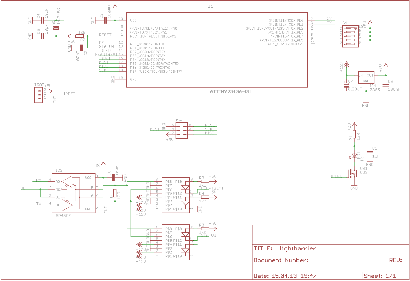 Hallo, ich habe eine Lichtschranke mit Busanbindung gebaut. Funktioniert soweit eigentlich, bis auf die Tatsache, dass schon 3x eine IR LED (LED1) durchgebrannt ist (bei 8 Lichtschranken und jeweils ca 2 Stunden Betriebsdauer). Die LED wird vom Attiny mit einem 36kHz Rechtecksignal angesteuert und es ist diese: http://www.farnell.com/datasheets/7975.pdf Laut Datenblatt habe ich für die Pulsdauer einen Strom von 300mA berechnet, 3,7V müssen an R1 vorher abfallen, also habe ich R=12 Ohm gewählt. Fällt da jemandem ein systematischen Fehler oder ist es nur "Zufall"?