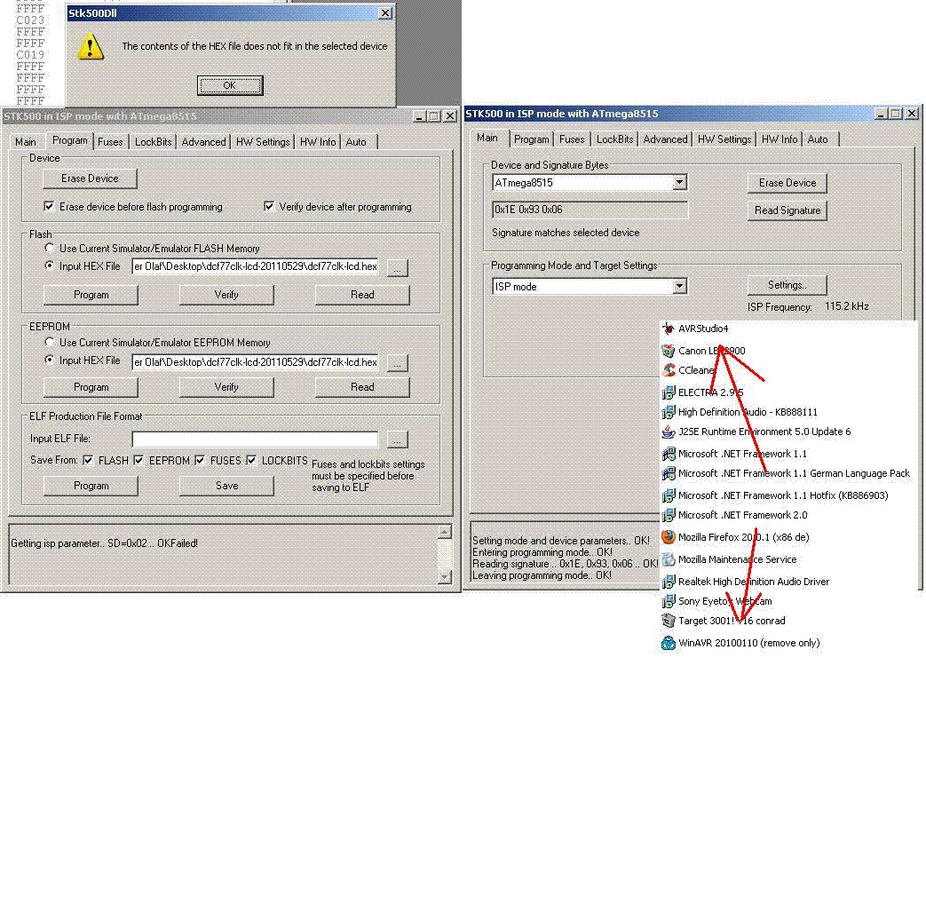 zu erstens meine Hardware windows xp 2001 AVR STK500 (serieller anschluss) und meine Software avr Studio4.18 mit WinAVR 20100110 der atmega 8515 ist nicht Defekt den Fehler habe ich mit allen Mikrocontrollern das STK500 ist auch nicht Defekt ich habe zuerst WinAVR und danach AVR Studio aber der Fehler bleibt weiterhin bestehen PS. Dateianhang Beachten ich hoffe einer von euch Profis kann mir weiterhelfen Gruß olafseger
