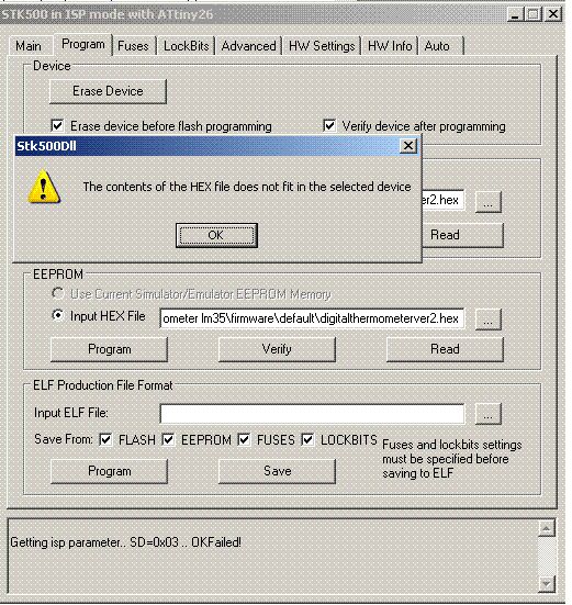 Du programmierst aber auf den Bild nicht EESAVE? Sondern Flash oder EEPROM(bitte passendes unterstreichen) Und "The selected HEX file does not fit in the selected device." bedeutet IMHO und nach meinen relativ bescheidenen Englischkentnissen "Die asugewählte HEX-Datei passt nicht in das ausgewählte Bauteil."