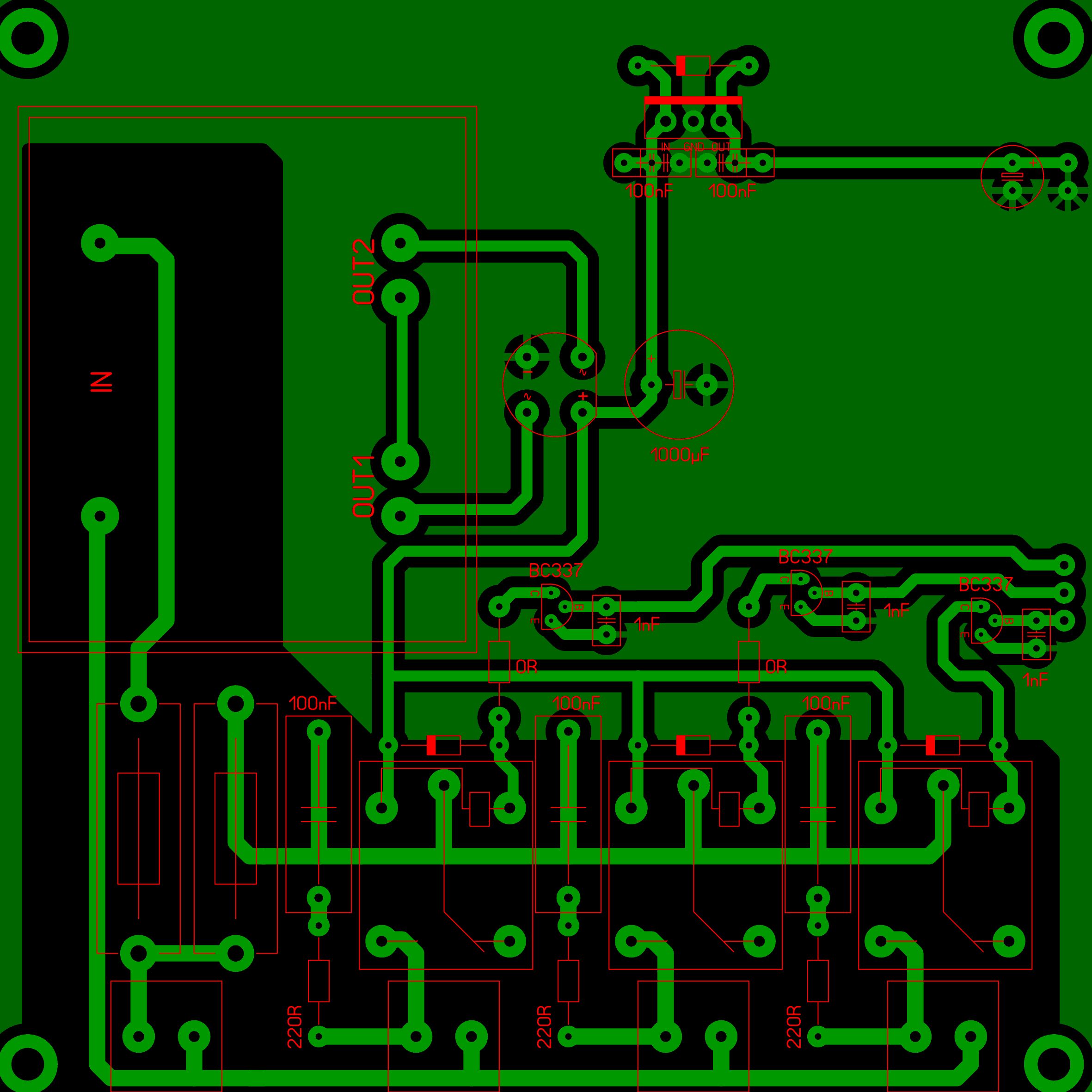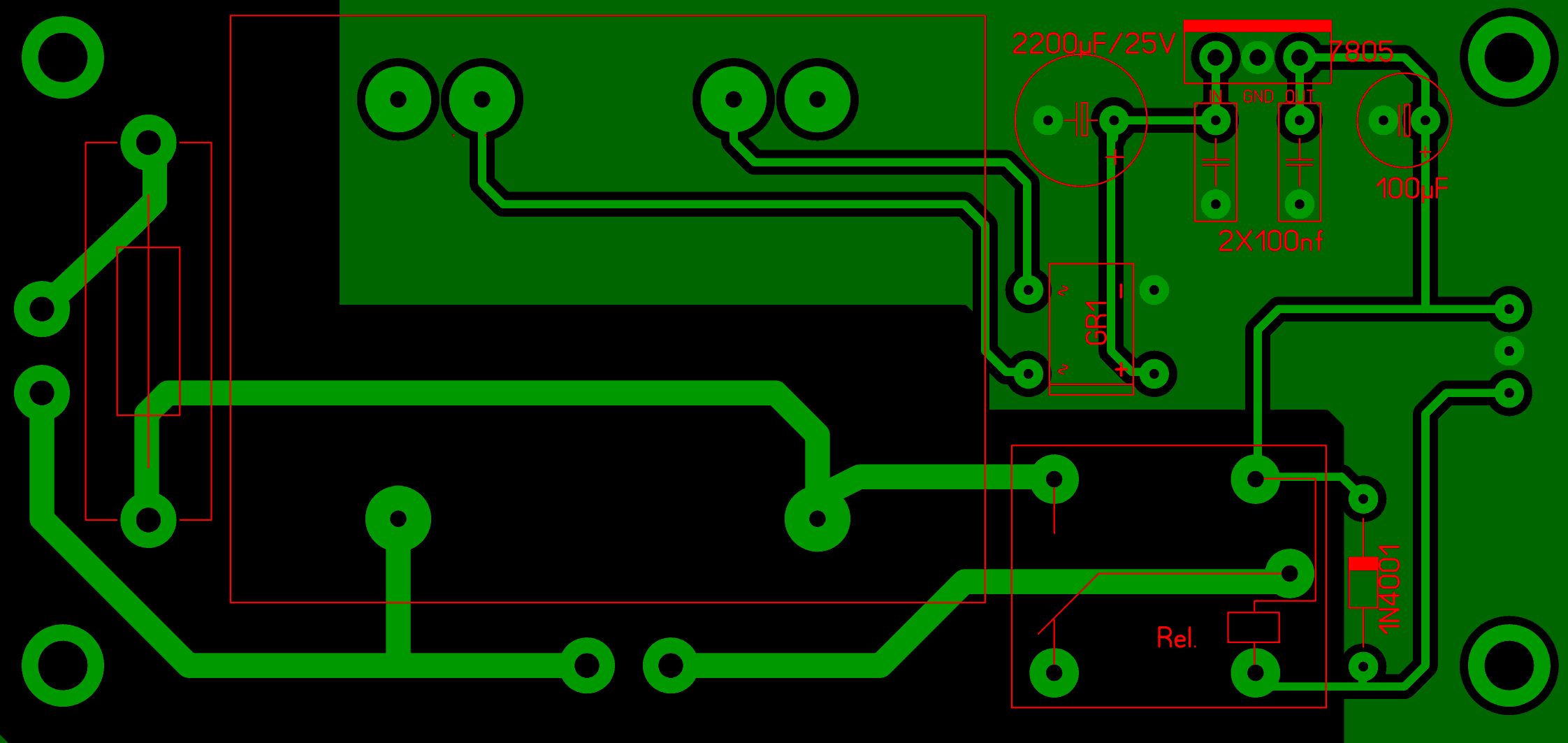 Andi schrieb: > Hier mal die Platine des Netzteils... Würde den GND-Anschluss des Relais direkt auf der Platine machen. Über die Verbindungsleitung bekommst Du die Störungen direkt vom Relais auf dein Controllerboard. Dem BC337 reicht 1k an der Basis und dort auf jeden Fall noch ein 1nF keramisch gegen GND dran. Der 7805er braucht am Eingang 330 nF (siehe Datenblatt), da habe ich schon schlechte Erfahrungen gemacht. Ripples am Ausgang. Das Relais ist aus meiner Sicht nicht gut geeignet, da dein 230V-Anschluss zwischen den Niederspannungsanschlüssen liegt. Ich nehme an, dass dieses Relais mehr für DC/AC-Anwendungen im Niederspannungsbereich ausgelegt ist. Besser wäre ein Kammrelais. Schau mal bei reichelt nach Kammrelais von Schrack. Die sind super für solche Anwendungen. Ja, kosten einiges, aber halten sehr lange. Viel Erfolg!