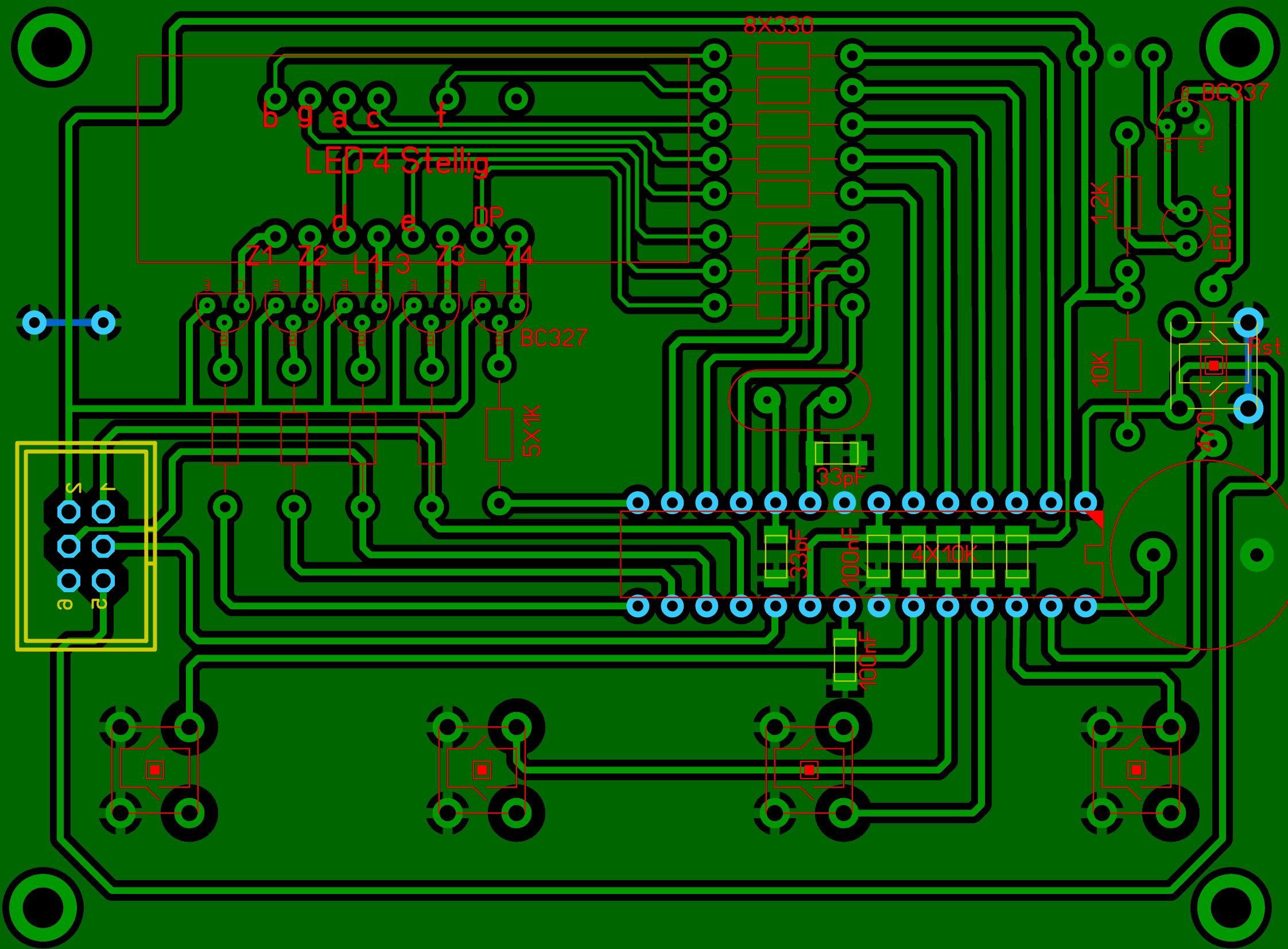 Dein GND ist aber ziemlich zerstückelt... Die GND Inseln mit möglichst vielen Drahtbrücken miteinander verbinden (am Schönsten wäre natürlich ein zweilagiger Print) Ich würde zumindest Pin 8 und Pin 22 vom uC (beides GND) auf kürzestem Weg fett miteinander verbinden. Zwischen Pin 7 und 8 direkt am uC den 100n platzieren. Den Pull up bei dem Reset Pin auf 1k verkleinern; spricht etwas dagegen? Den 1n am Reset gegen GND zumindest im Layout vorsehen (muss später evt. nicht bestückt werden) EMV-mässig wäre es ausserdem nicht schlecht, die Widerstände zu den 7-Seg Anzeigen direkt bei den uC Pins anzuordnen. Die VCC Verbindung für die Common Treiber der 7 -Seg Anzeige scheint mir unschön gelayoutet, so um den ganzen Print herum, gibt es da keine kürzere Verbindung?.