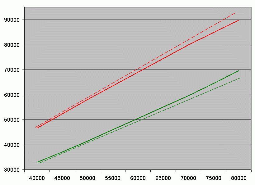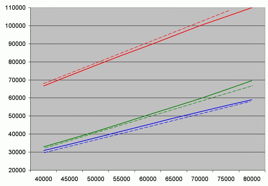 So, jetzt als Bild: Die Arbeitgeberbruttokurve flacht mit steigendem Bruttogehalt ab, die des AN steigt an, allerdings wird sie durch die Steuerprogression belastet und zusammengestaucht. Da der AG noch den Vorteil der sich besser verteilenden Arbeitsplatzfixkosten kann, kann er ruhig mehr drauflegen, als nur die 8/7.