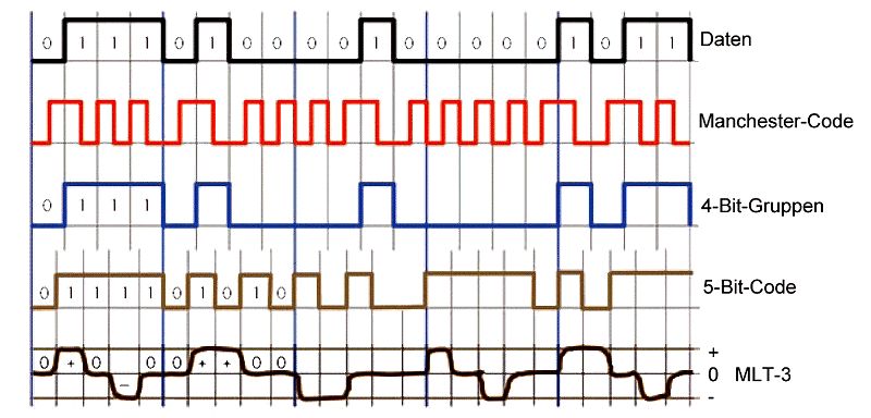 Ich habe jetzt mit dem Professor geredet und mich erkundigt. Ich muss meinen Anfangsbuchstaben übertragen was bedeutet ich muss eine Schaltung die Binär auf 4B5B umwandelt und eine die 4B5B auf den MLT 3 Code wandelt dann über eine Leitung schicken und wieder zurückwandeln.