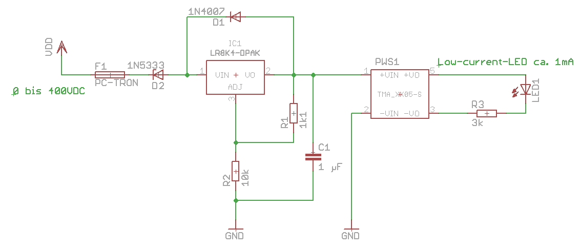 Moin, ich habe folgendes Problem: Eine Spannung von 40 bis 400V DC muss detektiert werden. Dazu dürfen der Sicherheit halber keine Hilfsspannungen genutzt werden, die Detektorschaltung muss also immer funktionieren, egal in welchem Zustand sich das Gesamtsystem gerade befindet. Also sobald die Spannung über 40V klettert muss eine LED angehen. Also als Sicherung nehme ich PC-Tron-Sicherungen, die als einzige bis 450VDC bei Leiterplattenmontage zugelassen sind (zumindest mir bekannt). Als Z-Diode nehme ich die 1n5333 mit einer Z-Spannung von 24V. 24V, da 24V+15V Anlaufspannung des Linearreglers sind 39V. Der LR8 kann zwischen 15 und 450V Eingangsspannung ab. Warum DC/DC+Linearregler? Um die LED galvanisch getrennt zu haben und auch am Gehäuse außen befestigen zu können. Der Linearregler schiebt das nur in den Spannungsbereich runter, den der DC/DC verkraftet. Funktioniert die Schaltung, falls nicht warum nicht? Und natürlich: Wie könnte man es besser machen?