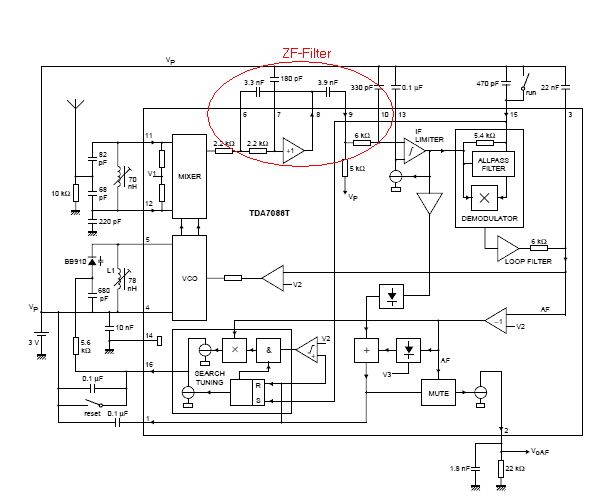 Laut dem Datenblatt http://www.datasheetcatalog.org/datasheet/unisonic/TDA7088.pdf müsste man zum Test ein ZF Filter in reihe zu dem 3,9nF Kondensator an Pin 9 des IC schalten. Laut dem Datenblatt auf Seite 3 ist der Pin 9 wohl ein ZF Eingang. Sofern die ZF auch 10,7MHz ist sollte das eventuell funktionieren.