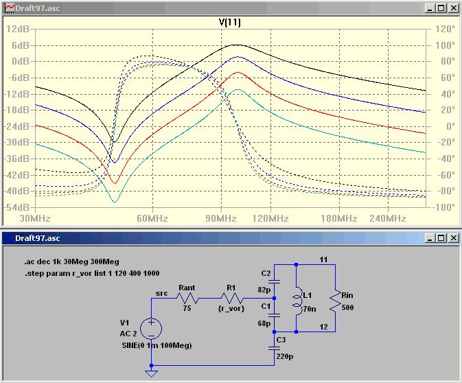 Lässt sich die L1 bzw. in Deinem Schaltplan die SP2=70nH abgleichen, ist das eine Luftspule? Möglicherweise liegt die Resonanz gar nicht auf UKW. Probier mal wie in der angehängten Schaltung ein 500 Ohm oder 1 kOhm Poti als HF-Regler in die Antennenleitung zu schleifen. Falls zurückregeln was bringt, dann ist der TDA übersteuert.