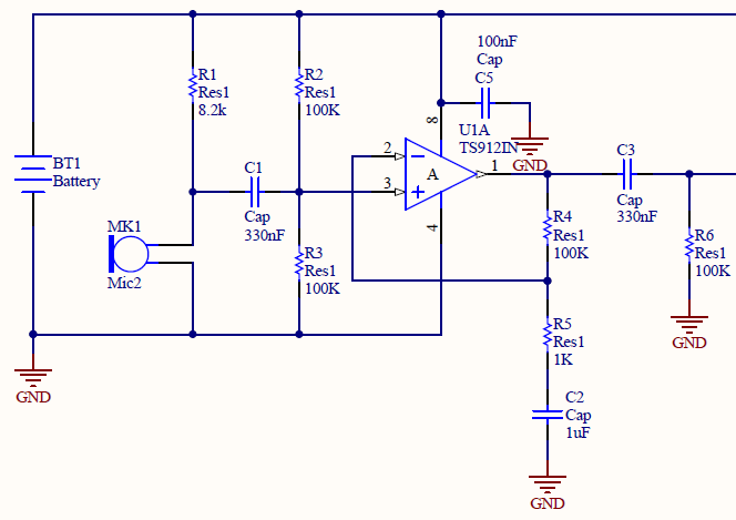 Hallo, ich hab da ein paar Fragen zum Verständnis. Bitte korrigiert mich, wenn ich falsch liege. - R1 dient zum Versorgen des Mikrofons mit Strom/Spannung. - mit Hilfe von C1 wird die Wechselspannung des Mikrofons auf die halbe Betriebsspannung drauf addiert. Gleichspannung wird geblockt. - der OP ist als nicht invertierender Verstärker geschalten. Am Ausgang des OP ist die verstärkte Wechselspannung des OPs mit einem Gleichanteil von halber Betriebsspannung. Durch C3 sperrt die Gleichspannung. An R6 liegt die verstärkte Wechselspannung an, die auch negative Werte annehmen kann (obwohl nur mit single supply versorgt). Welche Funktion genau hat C2? Lasse ich ihn weg, funktioniert die Schaltung nicht. Vielen Dank im Voraus