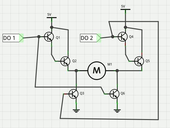 > und habe bereits eine Schaltung geplant. An Basis von Q6 und damit DO1 können maximal 0.7V anliegen, sonst brätst du den Q6 durch. Wie soll da der Darlington Q1/Q2 jemals durchschalten ? (Ebenso Q3 bei Q4/Q5). Nehemen wir an, du baust das richtig: Was passiert wenn DO1 und DO2 beide aktiv sind, z.B. beim Einschalten des uC bevor das Programm läuft ? Was passiert, wenn die Transistoren ausschalten, die Induktivität des Motors will doch den Strom weiter fliessen lassen, findet aber keine Freilaufioden, es entsteht also ein Zündfunke bis deine Transistoren durchschlagen. Was passiert wenn du den Motor ausschaltest, wohin geht die Bremsenergie ? > Gibt es eine einfachere Lösung NATÜRLICH hast du nichts über den Strom- und Spannngsbedarf deines Motors gesagt, aber deine Schaltung tagt nur für 3V/100mA Motore (350mA Anlaufstrom) Da sollte ein L293D die einfache Lösung sein. Bei stärkeren Motoren vielleicht auch L298 oder BTS7741 von Pollin an höherer Spannung.