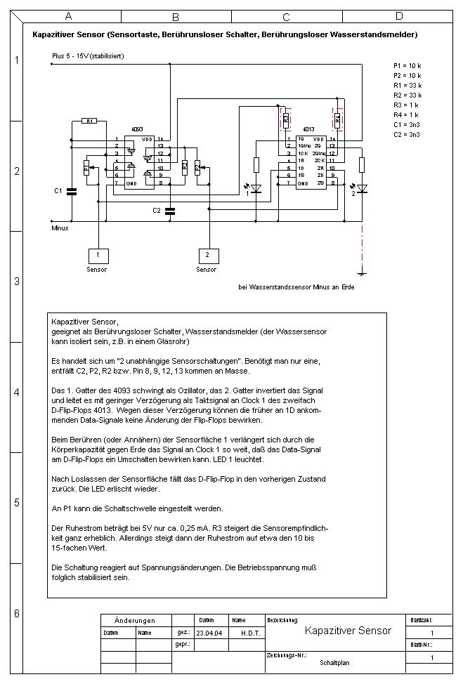 Hallo Leute! Ich bin ja echt ein Neuling, was integrierte Schaltungen und das ganze hier betrifft. Hab hier mal eine Frage, die von vielen von Euch wahrscheinlich schnell beantwortet werden kann. Ich möchte eine Schaltung aus mehreren Touch-Tastern realisieren. (siehe Anhang). Die Taster sollen dabei eine 24V Leitung eines Loxone-Miniserver steuern (http://www.loxone.com/Media/490856a6-ee37-422f-bff2-0e5e02dd34f0/DEU/Dokumentation/Verkabelung/anschluss-einer-jalousie.png). Die Frage ist nun: Welches Bauteil benötige ich? Anstatt der Dioden 1 und 2? Aus dem Datenblatt des 4013 (http://www.reichelt.de/index.html?;ACTION=7;LA=3;OPEN=0;INDEX=0;FILENAME=A240%252FMOS4013%2523STM.pdf) glaube ich heraus zu lesen (Diagramm), dass bei 5 V Betriebsspannung etwa 4 mA anliegen... sehe ich das richtig? Ich kenn mich da einfach ned aus :-( Ich denke, dass ich wohl ein Optokoppler das geeignete Bauteil wäre. Nur welchen brauch ich dann? Das 4013 soll entweder mit 5V oder 12V betrieben werden. Welche Bauteile wären nun die meiner Wahl? Bei 5 bzw bei 12 V Betriebsspannung? Vielen Dank für die Hilfe!! Matthias