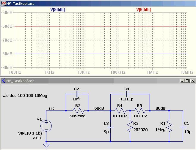 OK, hier meine Selbstbauvariante. Siehe Anhang. Die Widerstände sind ausgemessen, man kann auch 0,1% Typen kaufen. R1+R2+R3=900k R4+R5 = 111,1k C1 und C2 sind 5% Typen mit NP0/COG Dielektrikum. C4 ist ein 50pF Trimmer. Damit kann man das Ganze einfach enischleifen und kompensieren, der HV-Tastkopf muss nicht angefasst werden, der "sieht" nach wie vor 1M//13pF, so wie beim direkten Oszianschluss (Ok, die Kapazität ist geringer, spielt bei dem Tastkopf aber nicht die Rolle mit 12nF im Fußpunkt). MfG Falk
