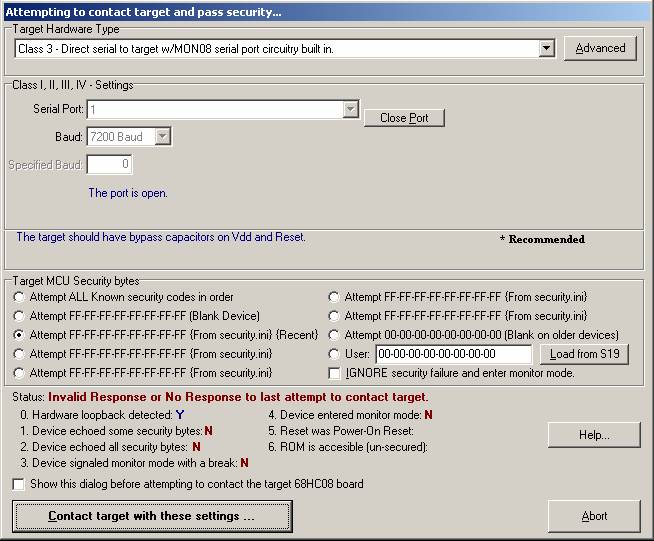 n' Abend. Ich scheitere gerade an der Inbetriebnahme meines nigelnagelneuen HC08 DemoBoard, bzw. CodeWarrior und könnte mal etwas Hilfe gebrauchen. Nach dem Starten des CW lade ich ein Demoprojekt, lasse compilieren und das Make-File erzeugen. Nun rufe ich den Debugger auf. Das Board hängt natürlich bereits an der RS232. Aber anstelle einer Erfolgsmeldung in Sachen Verbindungsaufbau gibt's ein: "Invalid or No Response" (s.Bild). Wo happert's denn nun. (Mal abgesehen von meinen Kenntnissen, aber ich bin ja auch Anfänger) Gruß Christian
