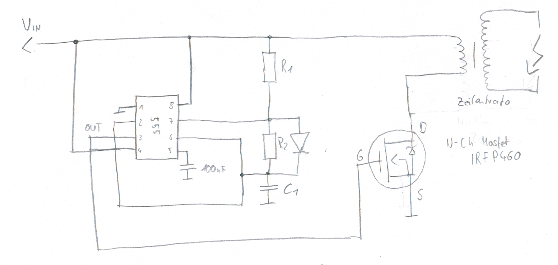 Moin Leute, ich habe mir eine Zeilentrafoansteuerung mit dem NE555er gebastelt: Der 555er ist als Astabile Kippstufe beschaltet. Pin 3 vom 555er - also OUT - geht auf einen MOSFET und zwar den IRFP460 (kann 20A, 500V) OUT vom 555er geht also auf Gate, Source geht auf Masse und Drain geht dann über einen Draht, den ich um den Kern des Zeilentrafos gewickelt habe, auf Plus. Die ganze Schaltung betreibe ich über ein Labornetzteil mit etwa 16 Volt, die Stromaufnahme variert zw. 1,5 und 2A. Der MOSFET hängt an einem Kühlkörper und wird noch von einem Lüfter angeblasen, wird also höchstens lauwarm. Soweit sogut, der Zeilentrafo spuckt auch Blitze was das Zeug hält. Jetzt wollte ich aber etwas testen und habe dazu an das dicke rote Kabel des Zeilentrafos, das oben rauskommt, einfach mal einen Draht gehalten, der mit der Erdung der Steckdose verbunden ist. Ein Blitz - schwupp und die Schaltung macht keinen Muks mehr, nur wird der 555er sauheis, OUT also überlastet. Beim Prüfen habe ich dann erkannt, dass der MOSFET offenbar nicht mehr richtig sperrt. Ich habe leider kein Oszi um das jetzt zu visualisieren, aber stellt es euch so vor: Man beschaltet den MOSFET so, dass Source auf Masse geht und Drain über eine LED + Vorwiderstand auf Plus, Gate kommt abwechselnd an Plus und Minus der Schaltung. Eig. sollte die LED jetzt ausleuchten-ausgehen, tut sie aber nicht und leuchtet stattdessen auerhaft, wird nur geringfügig heller, wenn man Gate an Plus hebt; kurzum, der IRFP 460 ist am A****. Jetzt wüsste ich gerne, warum. Ich würde nur ungern weiter rumbasteln und noch ein paar töten, denn die sind teuer. Könnt ihr mir helfen? Danke im Voraus!