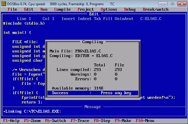 Elias B. schrieb: > Ja schon, aber ich will nur ne kleine exe die man auf den Zielrechner > kopieren kann um sie dann dort zu benutzen. Dann besorgst du dir am besten einen echten DOS-Compiler wie Turbo-C, die gibts sogar umsonst. Da die Compiler auch nur Konsolenprogramme sind oder bestenfalls ANSII-Grafik benutzen, sollten sie auch unter Windows laufen, notfalls mit Hilfe von DosBox (dem Programm, nicht der Eingabeaufforderung). Ich habe mir mal vorsichtshalber bei Borland ein Turbo-C 2.01 von 1989 runtergeladen, und Borland C mit 1m Handbuch und auf ca. 30 Disketten hatte ich auch mal, aber die habe ich glaube ich entsorgt. Gruss Reinhard