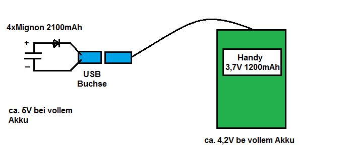 4 NiMH-Akkus haben unter Last eine Ausgangsspannung von 4,8V -> 4,0V mit Diode dann 4,1V -> 3,3V und damit für die meisten Handys zu wenig. Aus einen USB-Port am PC kommen ca. 5,3V - 5,1V auch mit 500mA Last. Also 5 NiMH Akkus + 1 Schottky-Diode => 5,7V -> 4,7V. Grüße Löti