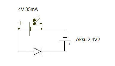 Hallo, da ich bei mir zu Hause eine Sollarzelle(Best.-Nr.: 191308 conrad) mit 4V und 35mA(leider nur 35) rumliegen habe, dachte ich mir das ich da ein Art Ladegerät bauen könnte. Mir ist schon klar, das ich da höchstens eine oder zwei NiMh Zelle laden kann.Ich dacht mir dass ich vielleicht auch zwei handelsübliche Batterien einsetzen könte, weil der Ladestrom ja gering ist. Jetzt ist das Problem, das ich nicht genau weiss, wie ich das Zeug verdrahten muss. Hab hier mal ein Bild wie ich mir den Aufbau vorstellen würde. Wenn es mölich wäre, würde ich die Sollarzelle als Fototransistor benutzen, und so z.B. das Nachts eine LED leuchtet.