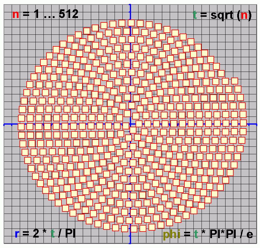 Ich habe es nun auch für ein 512er-System durchgespielt. Erstaunlich finde ich die optischen Wölbungseffekte, die entstehen, wenn man rechteckige Marker einsetzt. Dort setzt sich die Regelmässigkeit auch fort, allerdings ist der Startpunkt der 512 nicht mehr an einer Viertelbegrenzung. Also das scheidet als Regel erstmal aus. Ich habe bei der Vorgabe von PI und der Eulerzahl ein wenig grosszügig gerundet und gefunden, dass die Schnecke minimal rotiert, wenn man exaktere Werte einsetzt. Ich bin jetzt nicht mehr so sicher, ob das deterministische Werte sind - jedenfalls, was die Regelmässigkeit gegenüber Binärzahlen angeht. Diese bedürfen einer Multiplikation, die geringfügig unterhalb des Wertes Pi*Pi/e liegt. In jedem Fall eignet sich die so entstehende Schnecke schon mal als als Positionsvorgabe für eine entsprechende LED-Applikation, wer sowas braucht. Wie man sie ins EAGLE reinkriegt, steht hier: Beitrag "Re: EAGLE: Bauteile schneckenförmig platzieren"