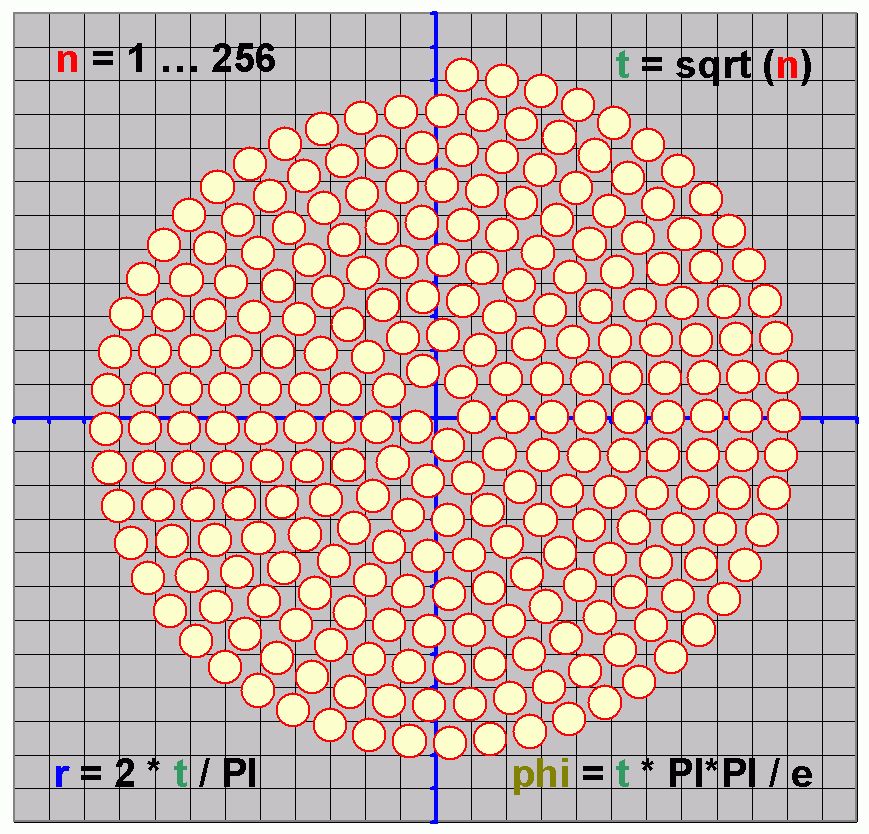 Für ein Scannersystem habe ich vor Jahren eine Rotationsabbildung generiert, die einen Punkt mit möglichst hoher Geschwindigkeit über eine Fläche führen kann, weil die existente Lösung minderwertig war. Das habe ich aktuell wieder hervorgeholt, um die Vorschrift für ein darstellendes System zu nutzen. Es geht um die Erzeugung eines wachsenden Kreises, bzw. eines rotierenden Punktes. Herausgekommen ist eine Schnecke, deren Punkte eine überraschend regelmässige Position besitzen. Es gibt mehrere Geraden durch die Punkte und obwohl es eine binäre Zahl ist, beginnen die Punkte 64, 128 und 256 jeweils am Beginn eines Viertels. Die sich aus der Bildungsvorschrift ergebenden Parameter sahen mir sehr verdächtig aus und intuitiv kam ich auf folgendes Resultat für äquidistante Punkte, die sich nicht überlappen und die Fläche gleichmässig füllen. Die Frage ist nun, ist das Zufall oder Einbildung oder ist der Zusammenhang zwangsläufig? Wer kennt sowas oder kennt Bildungsvorschriften für solche Fälle? Ich habe mal recherchiert und nichts gefunden.