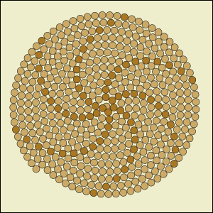 sitzen die Punkte weiter auseinander als bei der optimalen Anordnung. Anbei nochmal das Bild mit optimaler Anordnung der Punkte, jedoch so eingefärbt wie bei der regelmäßigen Anordnung. Die braunen Linien sind zu Spiralarmen verzogen wegen