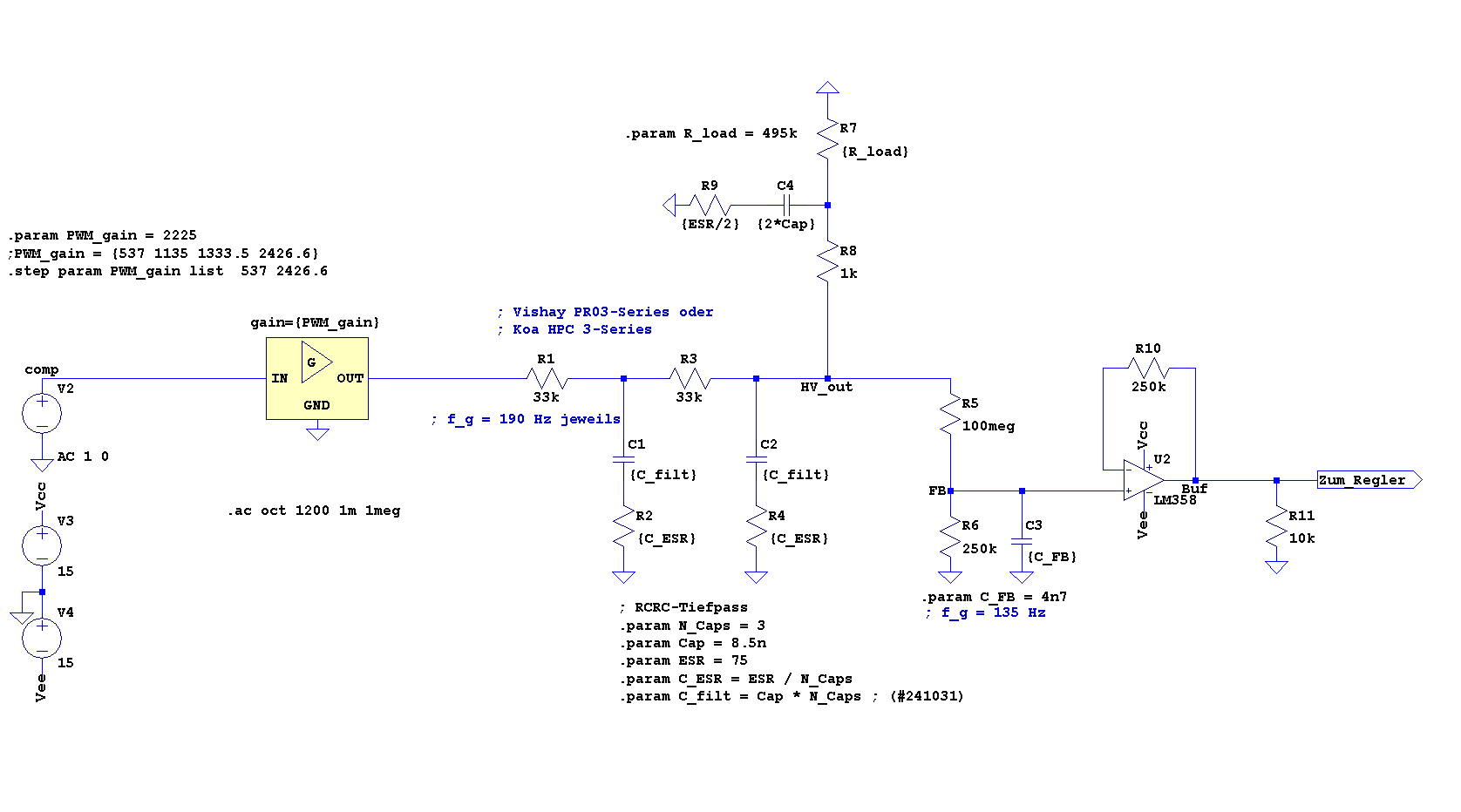 Hallo, ich stehe gerade vorm Wald. Ich habe ein kleines HV-Netzteil konstruiert mit RC-Ausgangstiefpass, das prinzipiell gut funktioniert und auch stabil ist. Ursprünglich hatte es ein RC-Tiefpass am Ausgang und ich habe den Regler nach Venable (Type 3) [1] optimiert. Vorgegangen bin ich dabei so, dass ich die Grenzfrequenz vom Ausgangsfilter und Feedback gleich gemacht habe und durch diesen Doppelpol einen Abfall von 40 dB/Dekade erreicht habe. Die erechneten Werte brachten eine gute Phasenreserve von 70° und besser und der Regler war angenehm stabil und schon auf Anhieb sehr ruhig. Leider reicht es nicht und insbesorndere niederfrequente Rauschen wird noch nicht ausreichend unterdrückt. Ich muss daher wohl ein RCRC-Tiefpass verwenden. Doch ich weiß nicht, welche Reglerstruktur ich hier verwenden muss, und wie er dimensioniert werden soll. Zusammen mit dem Kondensator hinter dem Feedback-Widerstand erhalte ich ja drei Polstellen und ich vermute, dass der Regler nun auch eine Polstelle mehr erhalten muss (?). Doch wie? Hat jemand Erfahrungen oder einen Lösungsansatz? Beste Grüße, Marek (kein Regelungstechniker) [1] Pressman, Billings, Morey; Switchming Power Supply Design; McGrawHill 2009