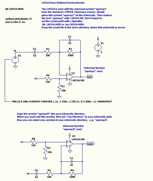 So ein Symbol lässt sich leicht ändern. Einfach mit dem Symbol-Editor opamp2.asy öffnen, die Eingangs-pins verschieben und dann abspeichern als opamp2i.asy. Alle angehängten Dateien in ein Verzeichnis kopieren. Dieses Extra-Symbol solltest du immer in das jeweilige Schaltplanverzeichnis kopieren. Damit vergisst du nie es anderen mitzugeben, wenn du Schaltpläne weiter gibst.