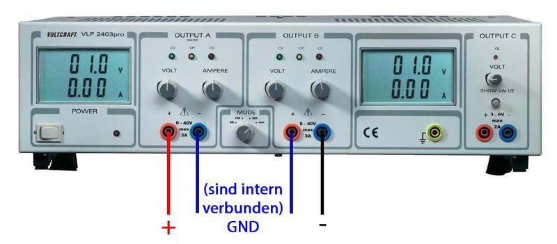 Vielen Dank für die freundliche Antwort. ;-) Ja, genau das habe ich wie oben bereits geschrieben schon gemacht... Ich besitze wie gesagt ein VLP 2403 Pro. Aus dem Handbuch: "Modell VLP 2403 Pro verfügt über einen Wahlschalter (14) mit dem man zwischen verschiedenen Betriebsarten schalten kann. Er verbindet die Ausgänge A und B innerhalb des Geräts. Extern anzuschließende Jumperkabel zur Verbindung von (+) und (-) Pol verschiedener Ausgänge sind nicht notwendig." Mir geht es nicht darum, wie ich die beiden Ausgänge in Reihe schalte, sondern darum ob etwas kaputt gehen kann wenn ich den Mittelabgriff auf Ground lege und ob das so gedacht ist. Danke und Gruß