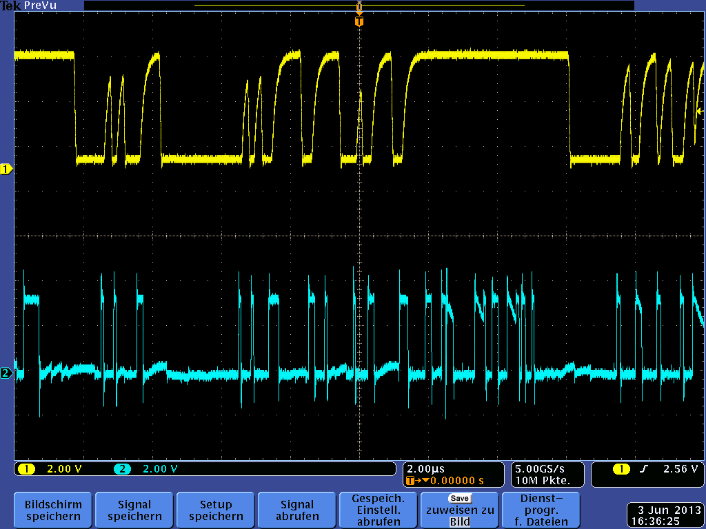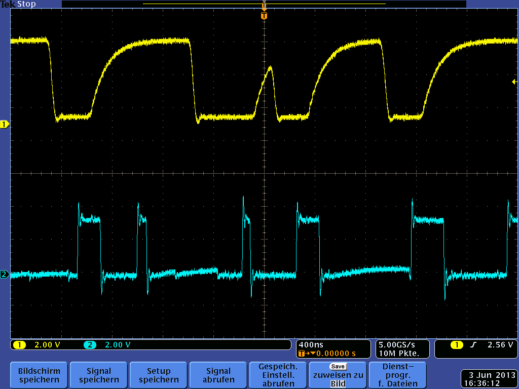 Ich habe eine Einfache LWL Übertragungsstrecke aufgebaut: http://www.farnell.com/datasheets/47896.pdf (Seite 11) Wenn ich mit dem Scope Tastkopf direkt an die Schaltung gehe (SDRAM Datenleitung) kommen Plausible Werte heraus (Siehe Anhang, Türkis). Wenn ich den LWL Konverter dazwischenschalte, kriege ich das Verfälschte Oszillogram (Gelb). Am Testausgang vom Scope Funktioniert der Konverter Einwandfrei. Auf was kann das hindeuten? Ist die LED zu Langsam für das DRAM?