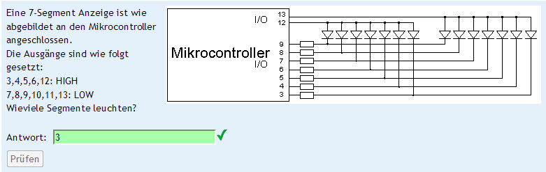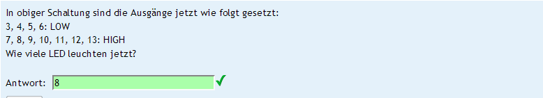 Manuela G. schrieb: > Hallo, > wir haben morgen einen Test in Elektrotechnik, dafür gab es auch einen > Probetest. Ich wollte fragen, ob mir jemand erklären könnte, wie man auf > die Lösungen in den Bildern kommt. Wenn leuchtet denn eine LED? Das Dreieck im Symbol hat eine Bedeutung. Es zeigt an, wie der Strom (von + nach -, von Hich noch Low) durchlaufen muss, damit sie leuchtet. Jetzt gehst du her und schreibst dir beim µC an den Pins die Belegung mit High bzw. Low dazu (ja, ich weiß - händisch schreiben ist im Zeitalter der SMS verpönt) und siehst nach, bei welcher LED es zutrifft, dass am breiten Ende des Dreiecks eine Leitung die High führt liegt, bzw. zu welchem Ausgang die Dreiecksspitze führt, der dann Low sein muss. Diese LED leuchtet. Dann zählst du einfach ab, wieviele LED leuchten.