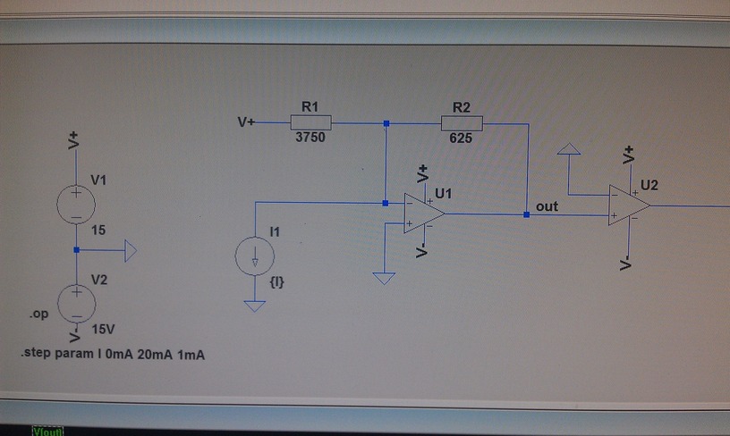 Ich hab nach langem herumprobieren nun endlich eine Lösung gefunden. Mit dem R1 ziehe ich immer die 4mA ab (15V / 3750E), die Stromquelle ist verkehrt herum eingebaut, somit habe ich immer eine negative Eingangsspannung im negativen Eingang. Die invertierte Beschaltung machts mit der gewünschten Verstärkung (durch R2) wieder positiv ... Laut simulation funktionierts :) Danke an alle die mir geholfen haben! MFG