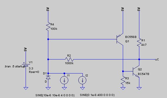 Nur falls es interessiert: Hier eine leicht modifizierte Transistorschaltung, die eine Schalthysterese aufweist. R2 und R4 skalieren natürlich mit dem zu erwartenden Fotostrom. LT Spice Simulation: Es wurde dem Fotostrom ein Rauschen von 10% überlagert. UB=3,3V Oben: Signalverlauf ohne R2 (keine Hysterese), unten mit Hysterese. Ich würde schon sagen, dass das Ergebnis die kleinen Mehrkosten rechtfertigt. Liebe Grüße Michael