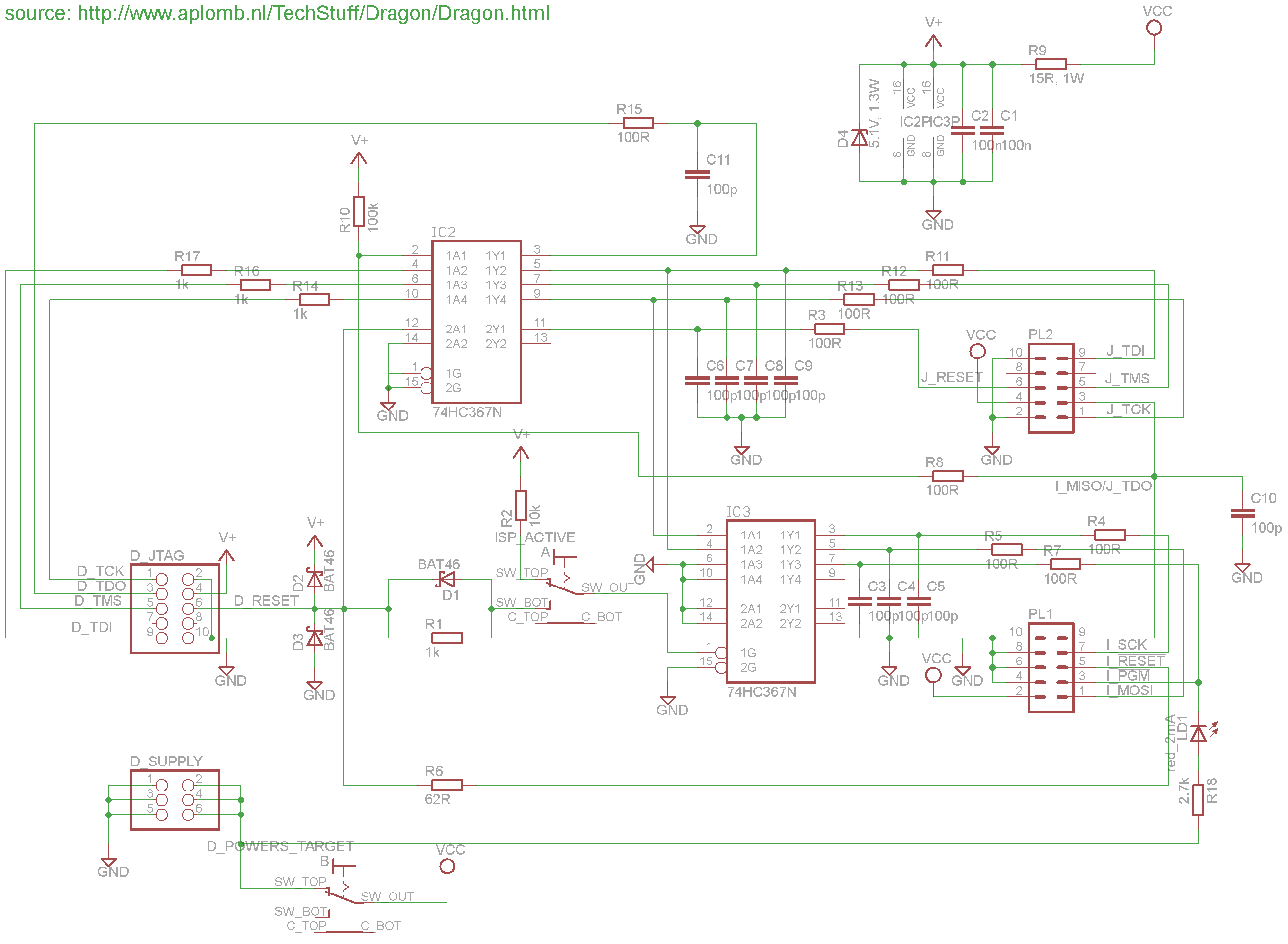 Hi, ich habe eben meine Dragonlair Variante zusammengelötet. Die Grundidee kommt von http://www.aplomb.nl/TechStuff/Dragon/Dragon.htm Der Plan ist, die I/Os des dragons über Puffer zu schützen. Über den Schalter unten auf dem Schaltplan kann man die Spannungsversorgung des Dragons auf das Target geben. Wenn ich (ohne dragon oder target verbunden zu haben) den Schalter in die entsprechende Stellung (nach oben) bringe und D_SUPPLY mit 5V/GND verbinde, zieht die Platine 280mA, was ich etwas viel finde, wenn man bedenkt, dass der USB-Port an dem der Dragon hängt insgesamt nur 500mA liefern könnte. Ist das ein Anzeichen dafür, dass D4 schon ziemlich weit offen ist und der Strom über R9 abließt? War das so gedacht? Dann könnte ich damit leben. Ansonsten bin ich beunruhigt. der Vollständigkeit halber die Erläuterung der Rest-Schaltung: Mithilfe des zweiten Schalters kann man in der (oben)-Stellung den einen Treiber deaktivieren, um den Dragon nur im Debug-Wire-Modus über die reguläre ISP-Schnittstelle (PL1) zu verwenden. JTAG und ISP sind auf dem Dragon übrigens einfach nur durchkontaktiert. Daher nur ein "Eingang" D_JTAG Das Paket aus D1 und R1 habe ich aus der ursprünglichen Schaltung so übernommen. Den Sinn dahinter habe ich selbst nicht ganz verstanden; im Zweifelsfall lege ich am Ende den anderen Schalterpin auf GND, um den Treiber in der (unten)-Stellung einfach zu aktivieren. Die 100p habe ich aus dem von mir zuvor verwendeten XILINX-JTAG Programmer übernommen